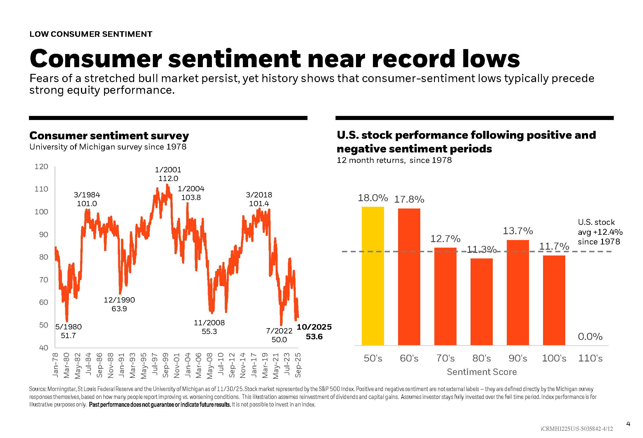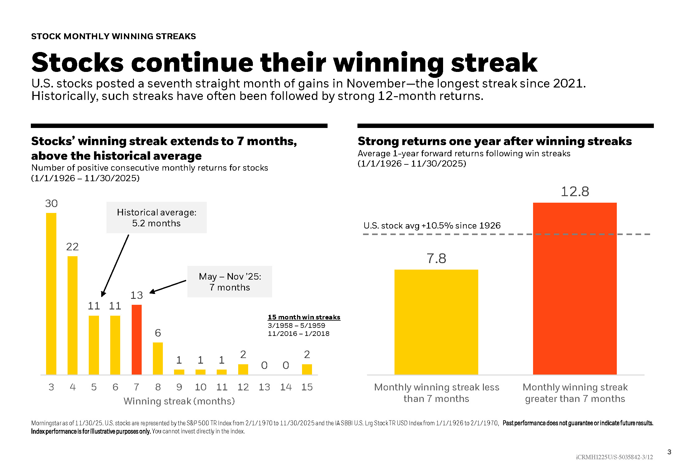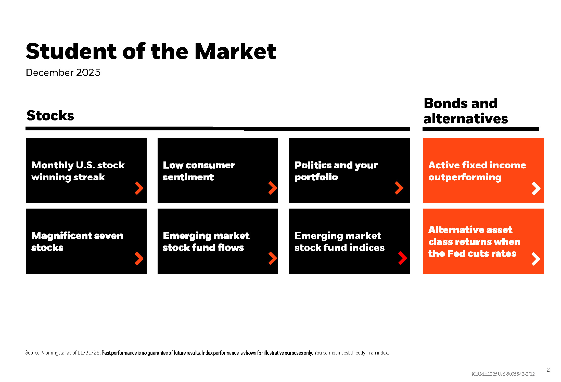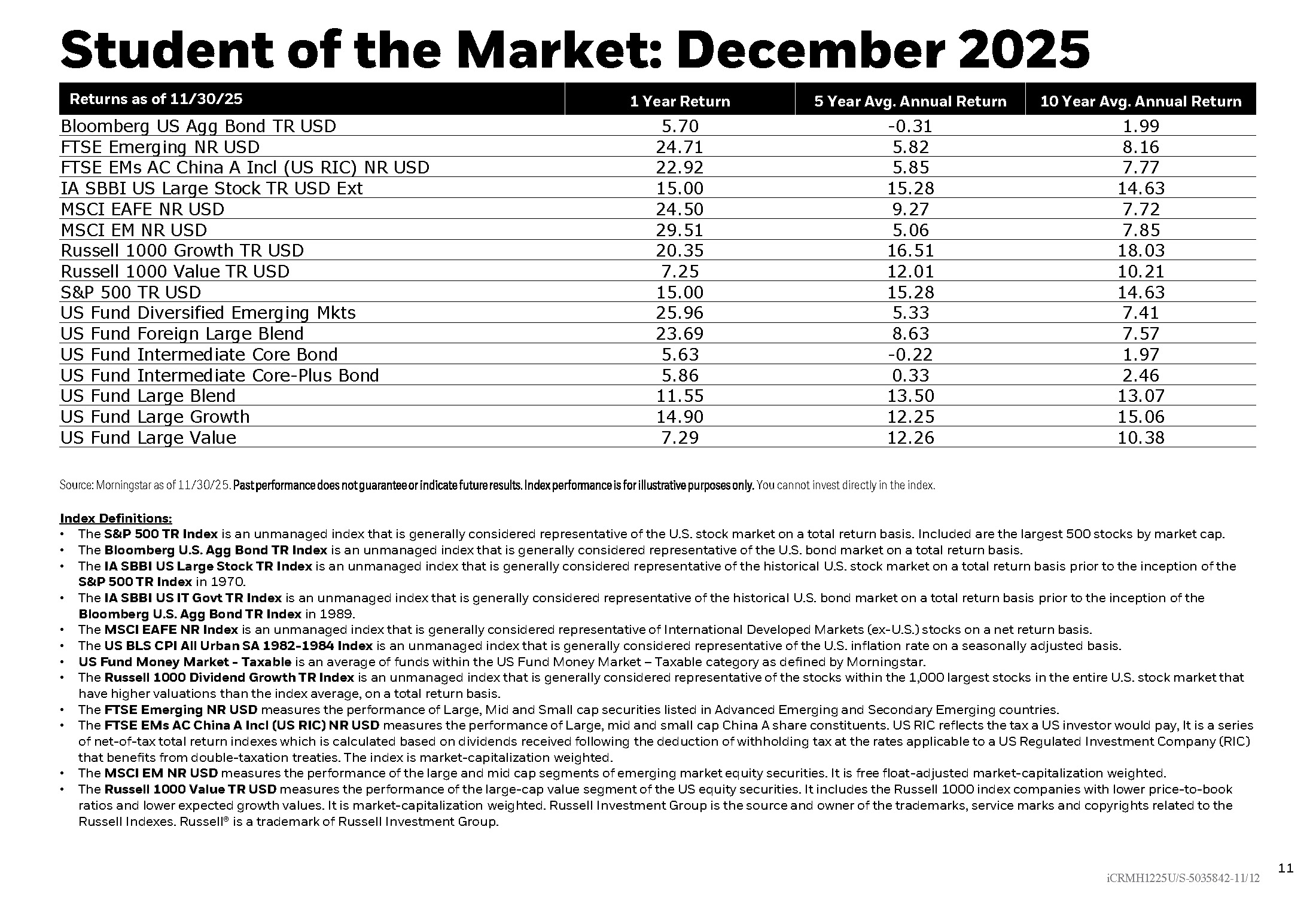 U.S. Stocks continue gains, the longest streak since 2021! Even so, consumer fears persist. See how the “Mag Seven” are performing as we close 2025. Additionally, a look at emerging stock index differences with adding South Korea. Finally, a historical look at Fed rate cuts.